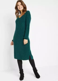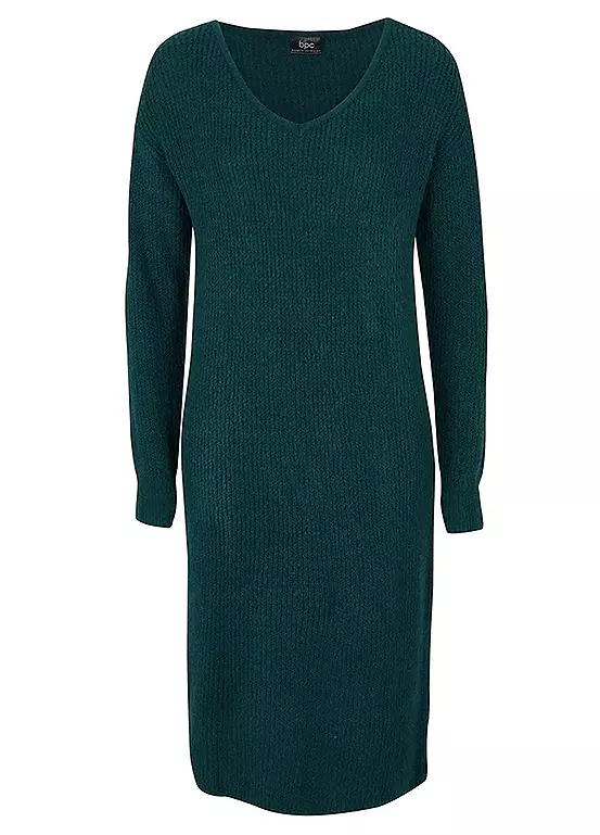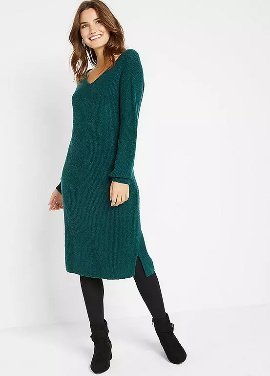 A v-neck dress in a smooth knit with a midi length skirt. Machine washable. 75% Acrylic, 22% Polyester, 3% Elastane. Length approx. 100 cm.
